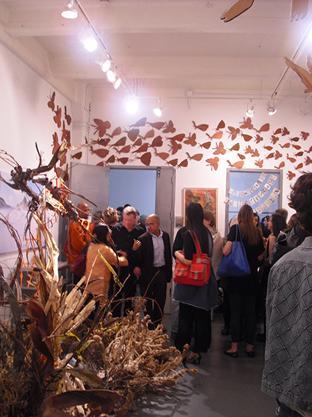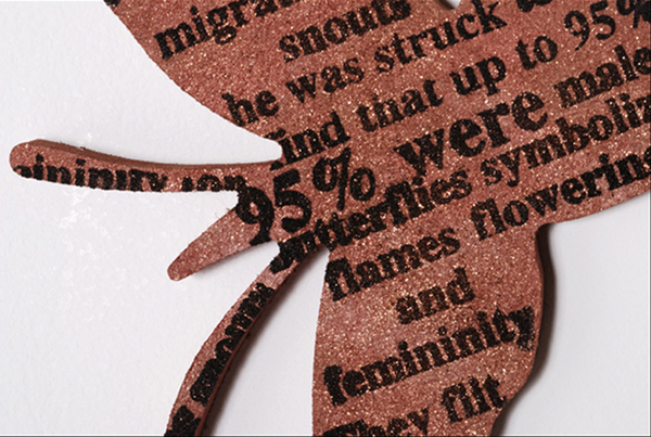 Mariposa Machismo is a project involving the butterfly phenomena that occurred in South Texas in the summer and fall of 2006 and is still ongoing to a lesser extent. A multitude of brown snout-nosed butterflies was generated by the unusual climate circumstances of extreme drought followed by torrential rains. Global warming was most likely a contributing factor. Curiously, 95% of them were male. The wall installation documents this unusual phenomena while examining the historical and current social implications of male butterfly bonding. Butterflies have also typically been associated with the ideals of femininity in the West. The butterflies are rendered on digitally cut MDF board, that has been rubbed with copper powder, and silkscreened using sand for a textural effect.