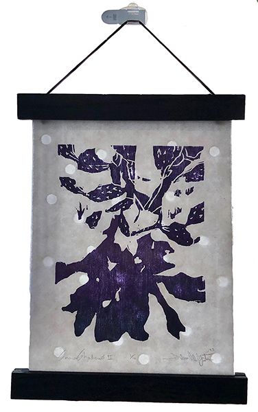 While on a Fulbright residency In Finland, I studied the rich heritage of Scandinavian design. This research led to further simplified forms. Natural objects are magnified and cropped until they become otherworldly. Like a 19th century naturalist, I often sketch and paint flora and fauna on site. I use these drawings as touchstones for my studio work. I might base an edition of fine art prints on a sketch or re-create it on a larger scale. Design considerations are evident through the implementation of graphic line, negative space, actual texture, and limited color. I typically create an interplay between the gestural fluidity of water media and the structural line work of drawing or printmaking processes. More recent trips to Japan have also had an important impact on my work. As a printmaker, I work in a variety of mediums including collagraphs, etching, mixed media prints, screenprints, and woodcut. Go to Special Projects and Animations to see work associated with these prints.