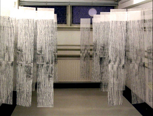 A Finnish girl stated that each winter, less and less snow falls in her country. They call this a “black winter” because without snow the landscape is very dark and gloomy. Another installation, Night Woods utilizes strips of sheer cloth printed using collagraphs made from plants near the lake or järvi. This work conveys the sense of a moonlit birch forest. I also editioned a collagraph called Summer's End using the same plate.